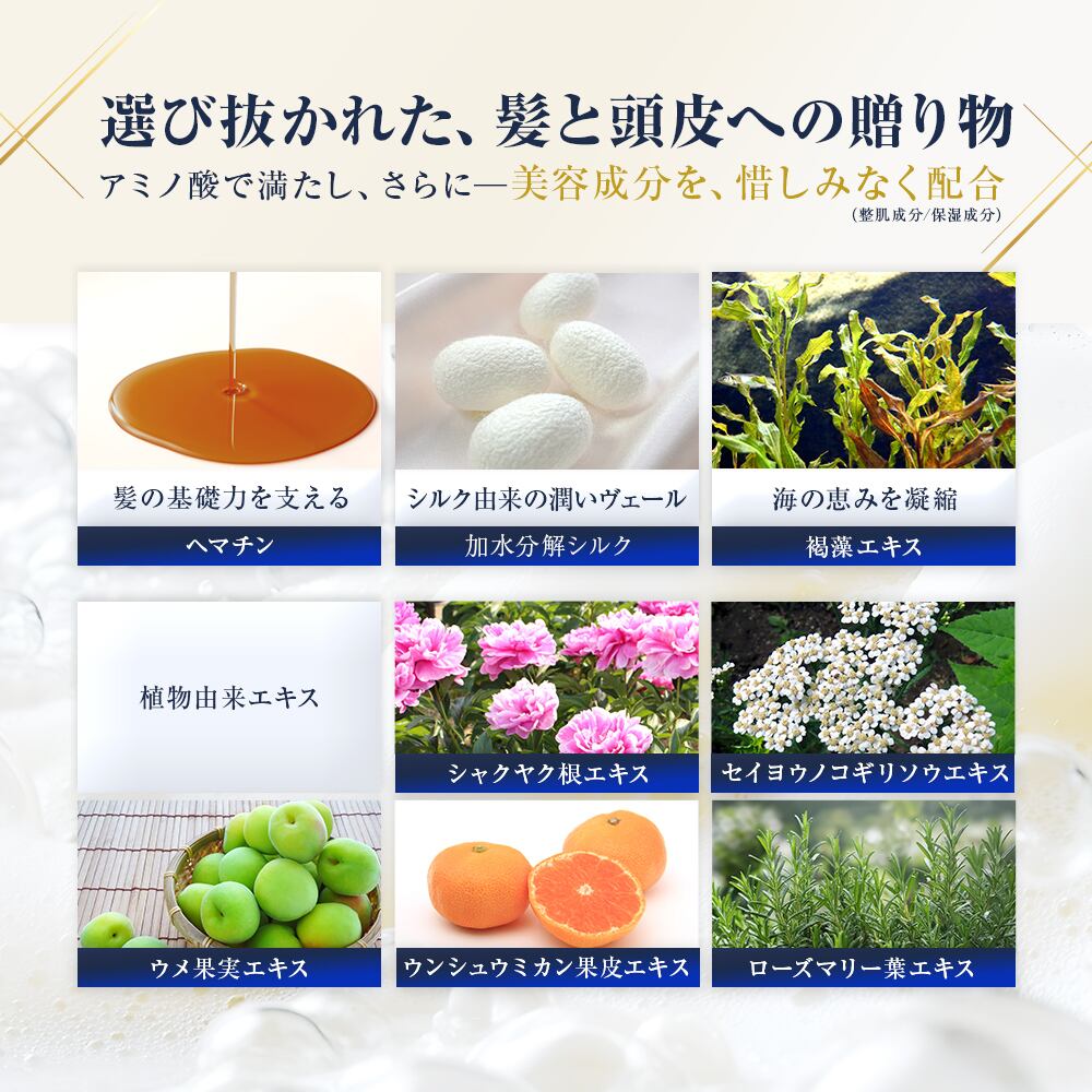 「100%天然由来」アミノ酸系洗浄成分とヤシ由来の洗浄成分を、独自の《ゴールドバランス処方》で繊細に配合。 濃密でクリーミィな泡が、髪と頭皮をやさしく包み込み、必要なうるおいを守りながら、しっとりと洗い上げます。