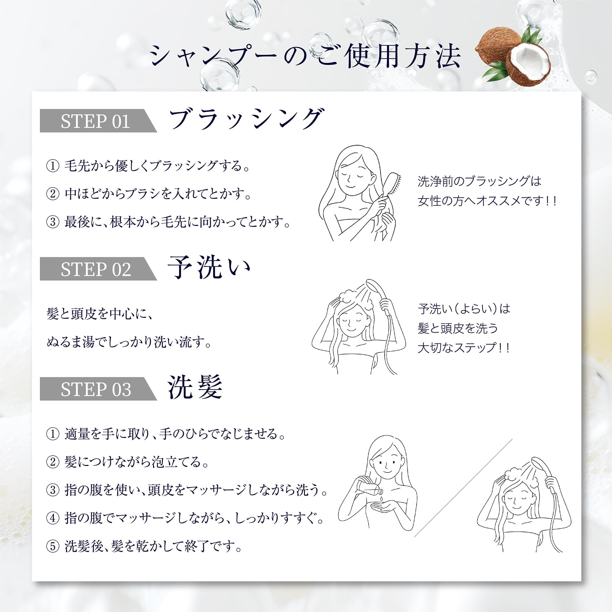 頭皮と髪をよく濡らして適量を泡立て、頭皮全体に馴染ませて、優しく洗浄してよく洗い流してください。