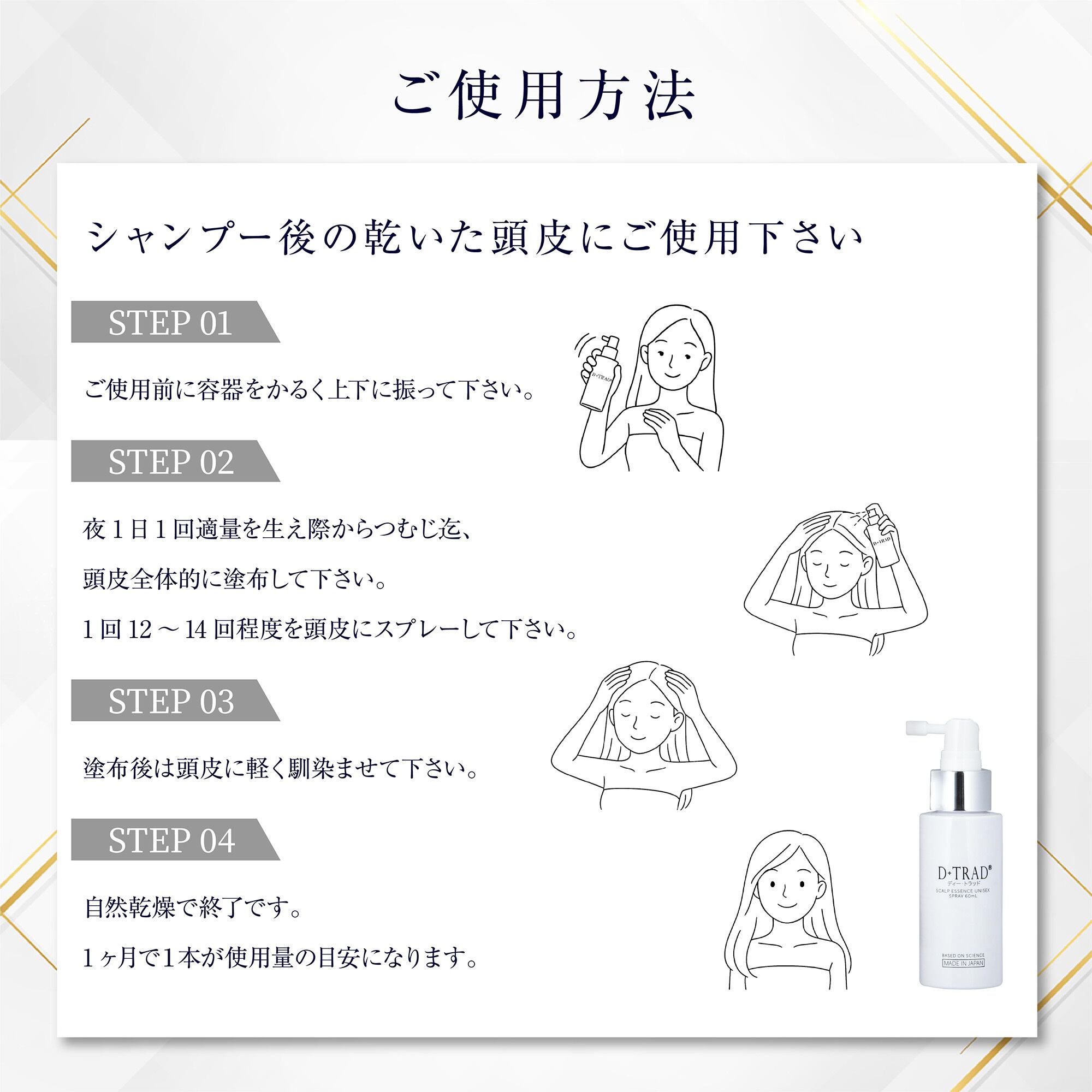 3.1日1回適量を生え際からつむじ迄、頭皮全体的に塗布して下さい。(1回12~14回程度を頭皮にスプレーして下さい)。